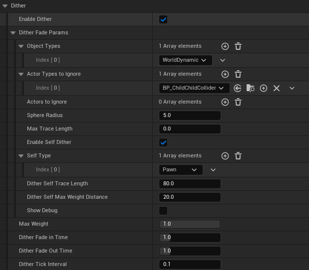 <table><thead><tr><th width="142.33333333333331">Parameter</th><th width="145"></th><th>Description</th></tr></thead><tbody><tr><td>Enable Dither</td><td></td><td>Whether to enable dither fade.</td></tr><tr><td>Dither Fade Params</td><td></td><td>A set of parameters defining dither behaviours.</td></tr><tr><td></td><td>Object Types</td><td>Array of object types of actors that should be taken into account for fade. Note that this parameter should exclude the type of self, which is usually Pawn.</td></tr><tr><td></td><td>Actors Types to Ignore</td><td>Actor types to ignore for fade.</td></tr><tr><td></td><td>Actors to Ignore</td><td>Actors ignored for fade.</td></tr><tr><td></td><td>Sphere Radius</td><td>Sphere radius for tracing objects.</td></tr><tr><td></td><td>Max Trace Length</td><td>Maximum trace length. Set as 0 to use the length from camera to target.</td></tr><tr><td></td><td>Enable Self Dither</td><td>Whether to enable self dither fade.</td></tr><tr><td></td><td>Self Type</td><td>Object type of self, usually Pawn.</td></tr><tr><td></td><td>Dither Self Trace Length</td><td>Trace length for dither fading the controlled pawn (self).</td></tr><tr><td></td><td>Dither Self Max Weight Distance</td><td>Distance determining max dither weight. If camera-hit distance is less than this value, weight of self dither would be the largest.</td></tr><tr><td></td><td>Show Debug</td><td>Whether to show debug info.</td></tr><tr><td>Max Weight</td><td></td><td>Maximum dither fade weight. 1 represents fully faded.</td></tr><tr><td>Dither Fade In Time</td><td></td><td>Fade in time.</td></tr><tr><td>Dither Fade Out Time</td><td></td><td>Fade out time.</td></tr><tr><td>Dither Tick Interval</td><td></td><td>Tick interval, in seconds. Large values save more performance but will result in lagging.</td></tr></tbody></table>