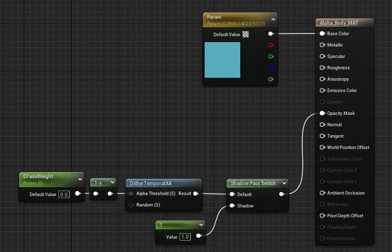 That is, first create a scalar parameter named **EFadeWeight** (mandatory name) and set its default value as zero; then substract it with 1 followed by a DitherTemporalAA node. Finally connect it to Opacity Mask.