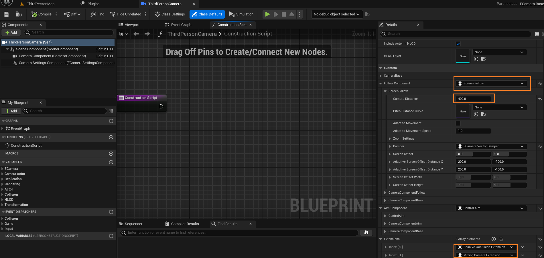 For example, you can choose a different follow component (aim component), edit its inner properties like `Camera Distance`, edit the `Damper` property and add or remove extensions. One thing to notice about editing the `Damper` property is you should first select the `ECamera Vector Damper` class (or other damper classes you defined or the plugin provided) and then edit inner properties such as `Damper X/Y/Z`. If you don't do so, it's likely you cannot successfully apply the modified `Damper` values to the camera blueprint.